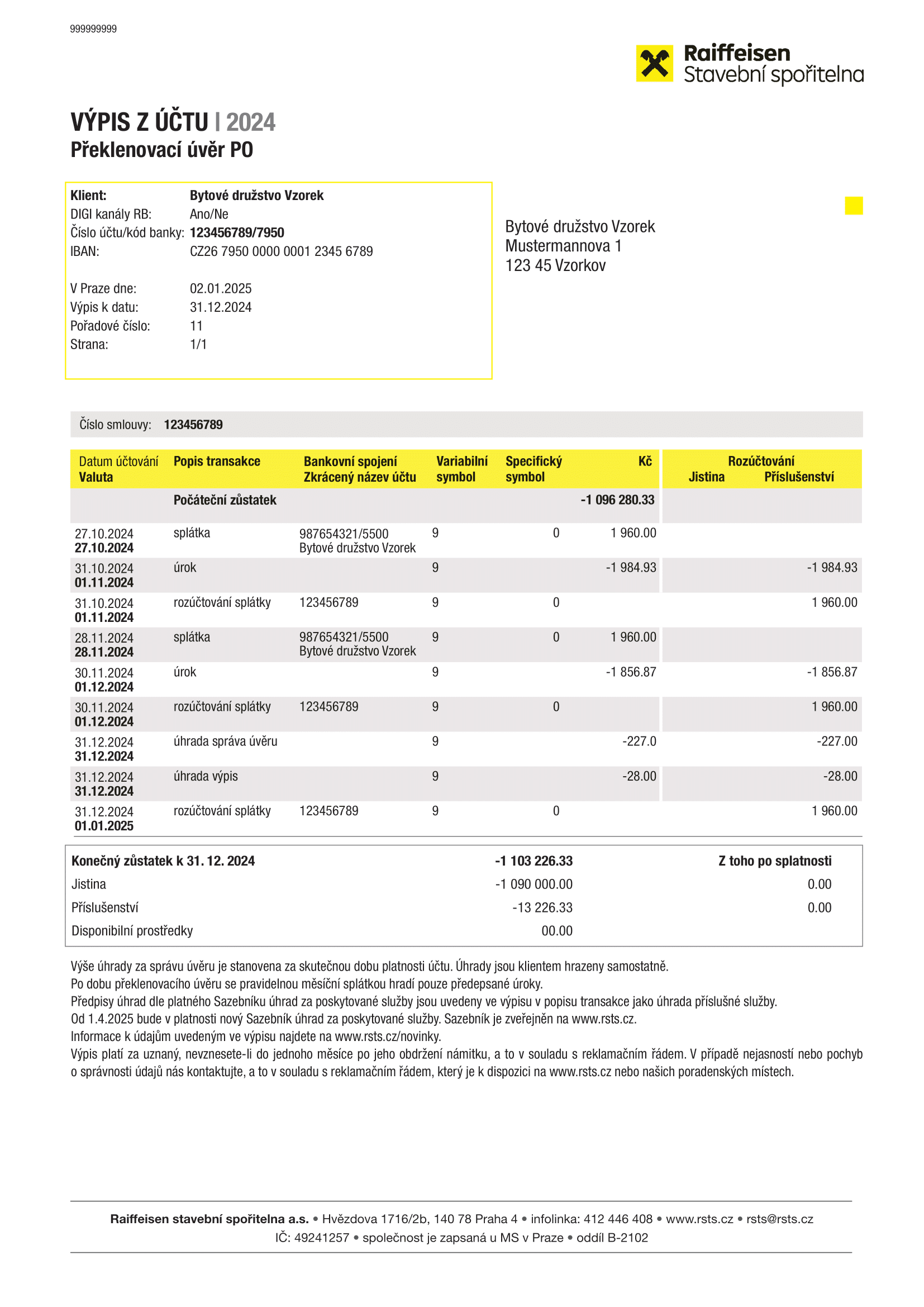 Předpis úhrady za zaslání výpisu z účtu (ve výši dle platného Sazebníku úhrad za poskytované služby). Tato úhrada je splatná následující měsíc po předpisu.