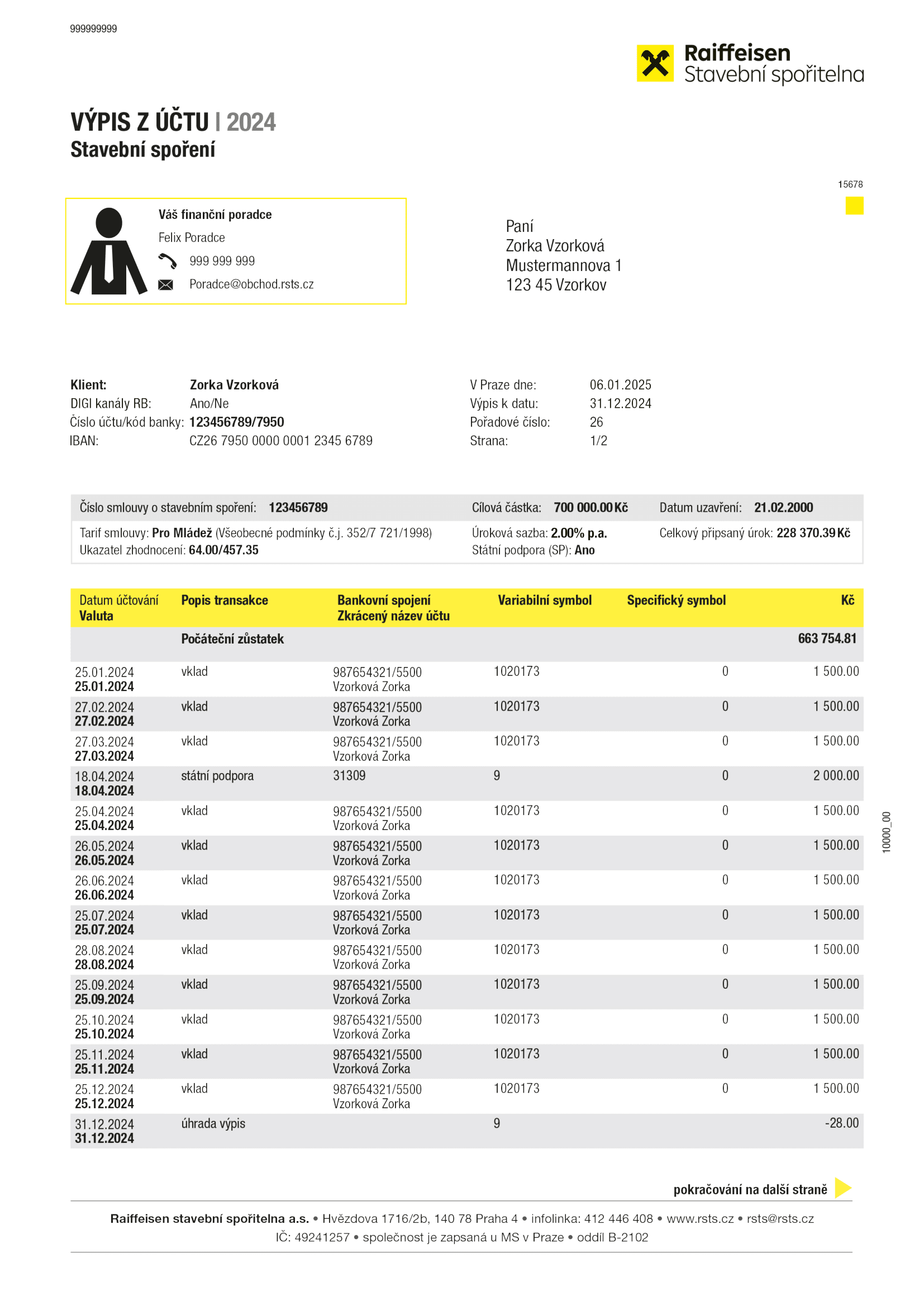 Konečný zůstatek na účtu stavebního spoření k 31. 12. 2024. Pokud výpis z účtu stavebního spoření vykazuje záporný zůstatek, je třeba uvedenou částku uhradit co nejdříve mimořádnou platbou na účet stavebního spoření!